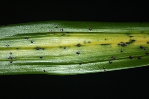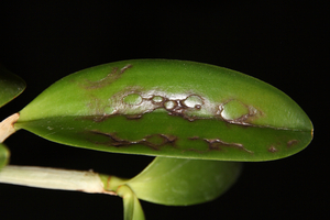დენდრობიუმზე ადრეულ სტადიაში ფოთლებზე ყვითელი ლაქებია,სხვადასხვ ფორმის და ზომის,თანდაათან ისინი ერთდებიან ,შავდებიან, მერე კი ფოთოლი ხმება,ან მაღალი ტენიანობის გამო ლპებიან.ფოთლის გარდა ზიანდება ყვავილიც,მათზე ჩნდება წითელი,ცისფერი ,მუქი ფერის ლაქები..