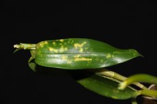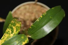 დენდრობიუმი: ტიპური გამოვლინებაა -თავიდან საშუალო ზომის რგოლები, რომლებიც თანდათან ერთდებიან, მერე ფოთოლი მთლიანად ყვითლდება,. ბოლოს კი ყავისფერი კონიდიები - სოკოს სპორების გროვები წარმოიქმნება .