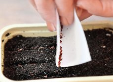 5. კვლებში ყრიან თესლს ზომიერი თანაბარი ოდენობით, ფრთხილად ასწორებენ კვლებს და მსუბუქად აყრიან ზემოდან მიწას თესლებს.