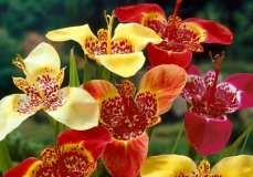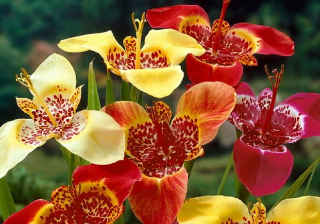 ტიგრიდია: ირგვება მაისში, ასევე მზიან ადგილზე 5 სმ სიღრმეზე. ყვავილობა იწყება ივლისის ბოლოს და გრძელდება 1,5 თვე, თუმცა ერთი ყვავილი მხოლოდ ერთ დღესაა გაშლილი, იმავე ბუჩქზე მერე სხვა იშლება. ბოლქვებს იღებენ სექტემბრის ბოლოს.
