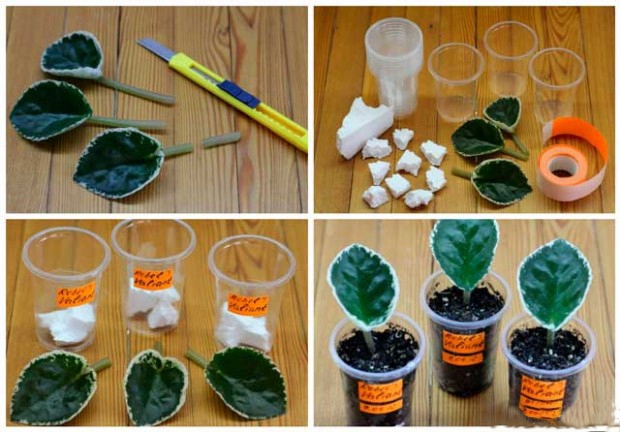 1. ფოთოლს დებენ წყლიან ჭიქაში, ისე, რომ ფოთლის ფირფიტა წყლის ზემოთ იყოს. 2 კვირაში გადანაჭერზე გამოუვა ფესვები და როცა ისინი 1-1,5 სმ ს მიაღწევენ სიგრძეში, ,მერე რგავენ წინასწარ მომზადებულ მიწაში.