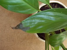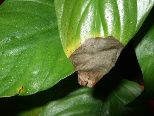 - ზედმეტი მორწყვა: ასე ემართება ფოთლებს ზედმეტი მორწყვისას ხანგრძლივი პერიოდის მანძილზე, თუ მას ხშირად რწყავენ, ფესვებში წყალი გუბდება, მიწა ჭაობდება. ფესვები ულპება , ფოთლები კი უშავდება.