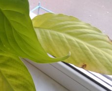 თუ მცენარე ასეთი მიზეზით გაყვითლდა, იგი უნდა გადადგათ უფრო ჩრდილიან ადგილში. მისთვის გამოდგება ჩრ. მხარე. მაგრამ თუ ბინის ყველა ფანჯარა სამხრეთით გადის, არც ეგაა საგანგაშო - მოაშორეთ რაფას მცენარე და დადეთ ოთახის სიღრმეში მაგიდაზე.